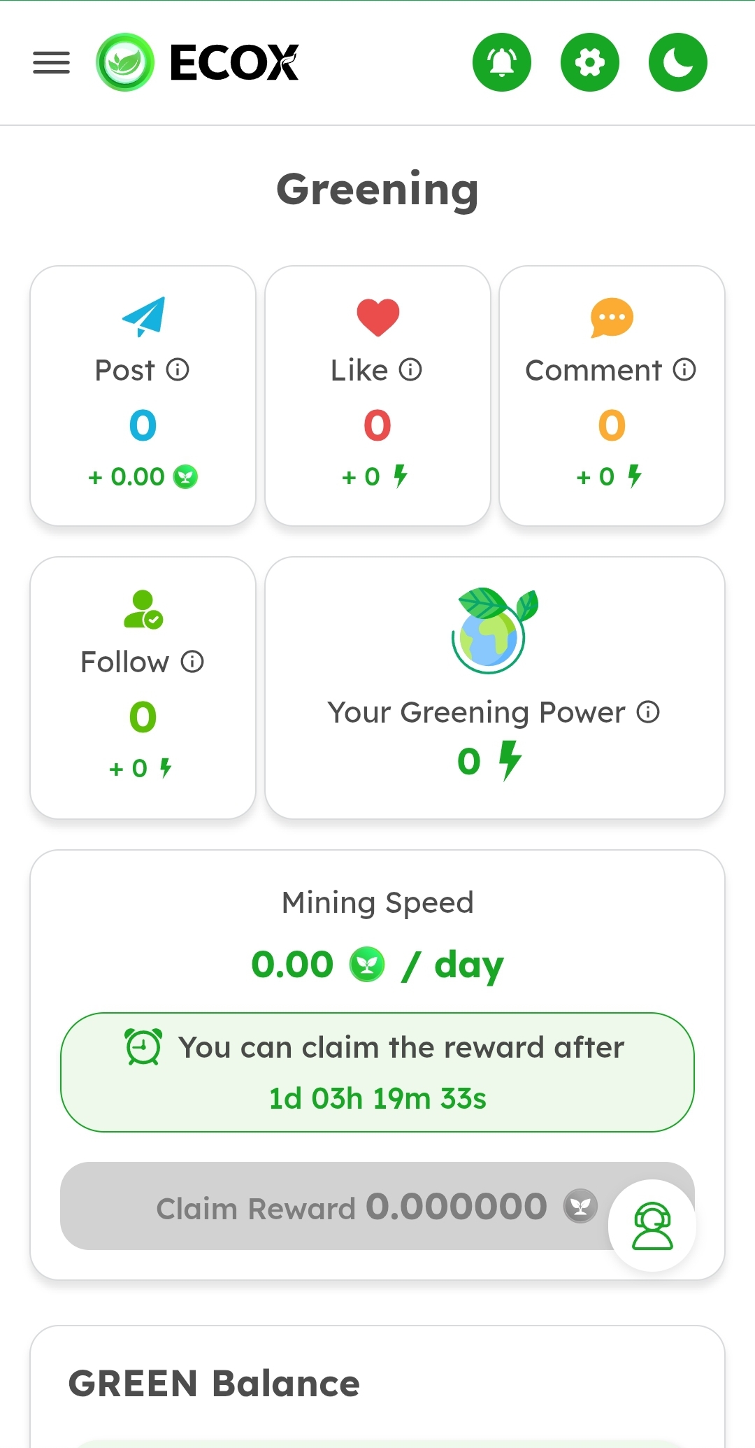 ECOX 네트워크 앱에서 간단한 활동을 통해 보상 포인트인 **GREEN(에콕스 리워드 포인트)**을 무료로 적립할 수 있습니다. 이 GREEN 포인트는 추후 ECX 토큰으로 전환되어 글로벌 거래소에서 거래될 수 있는 잠재력을 가집니다!
